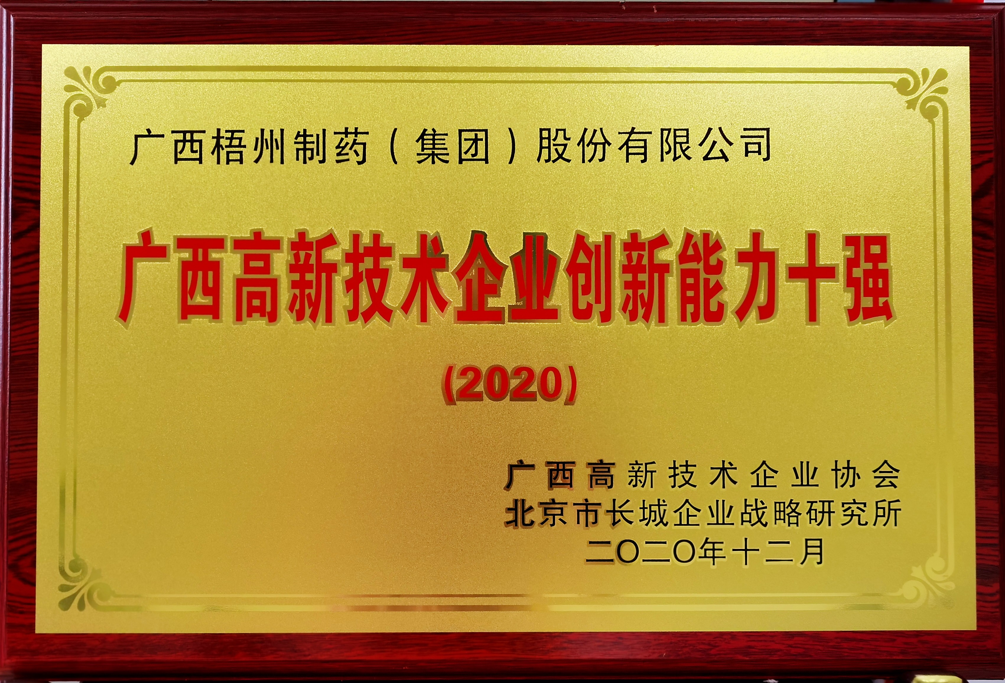 榮獲2020年廣西高新技術企業(yè)創(chuàng)新能力十強稱號