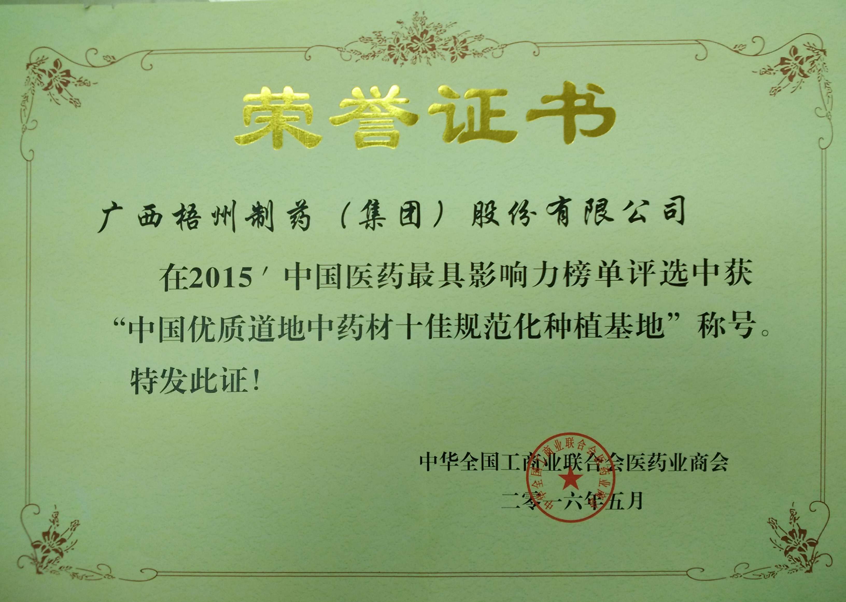 榮獲2015年度中國優(yōu)質(zhì)道地中藥材十佳規(guī)范化種植基地稱號(hào)