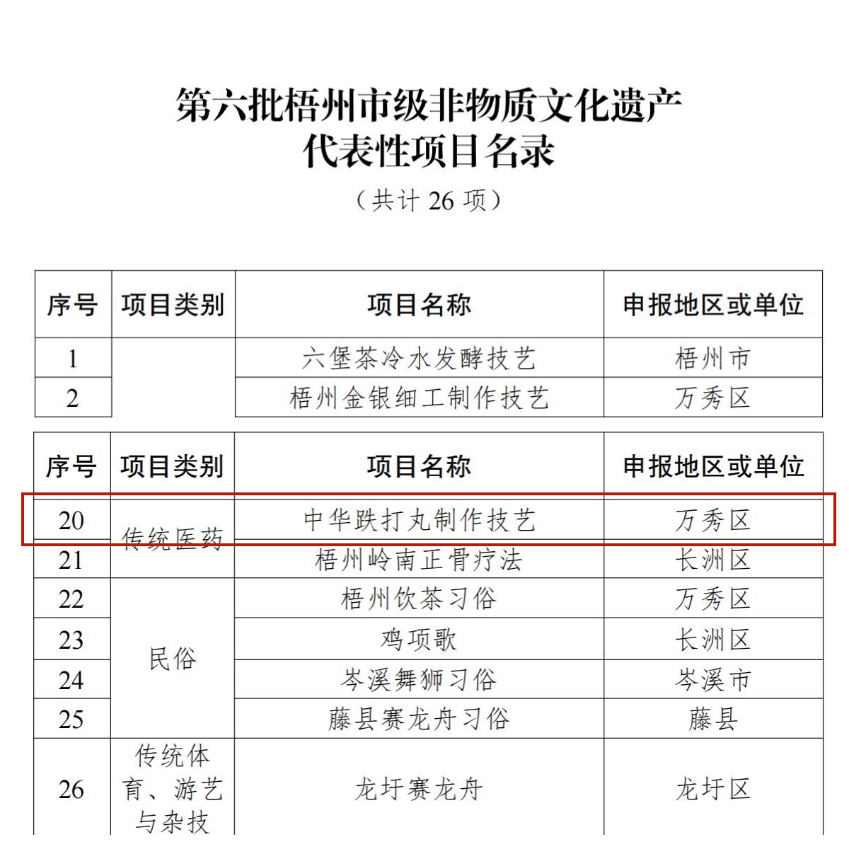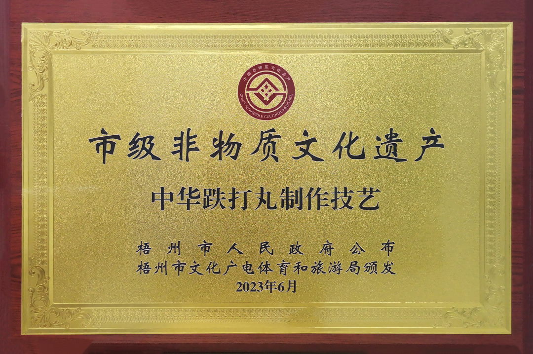 近日,在梧州市文化廣電體育和旅游局主辦的2023年“文化和自然遺產(chǎn)日”梧州市主會場宣傳展示活動中,梧州制藥中華跌打丸制作技藝獲授牌匾,成功入選梧州市第六批非物質文化遺產(chǎn)代表性項目名錄。
