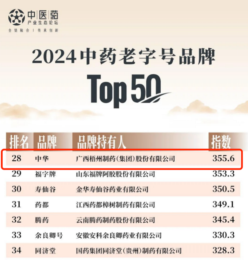“老字號(hào)”品牌 閃耀“中華”之光丨梧州制藥“中華”品牌榮登2024中藥老字號(hào)品牌TOP50榜單