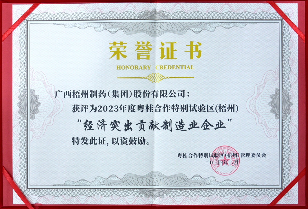 梧州制藥獲評為2023年度粵桂合作特別試驗區(qū)(梧州)經濟突出貢獻制造業(yè)企業(yè)