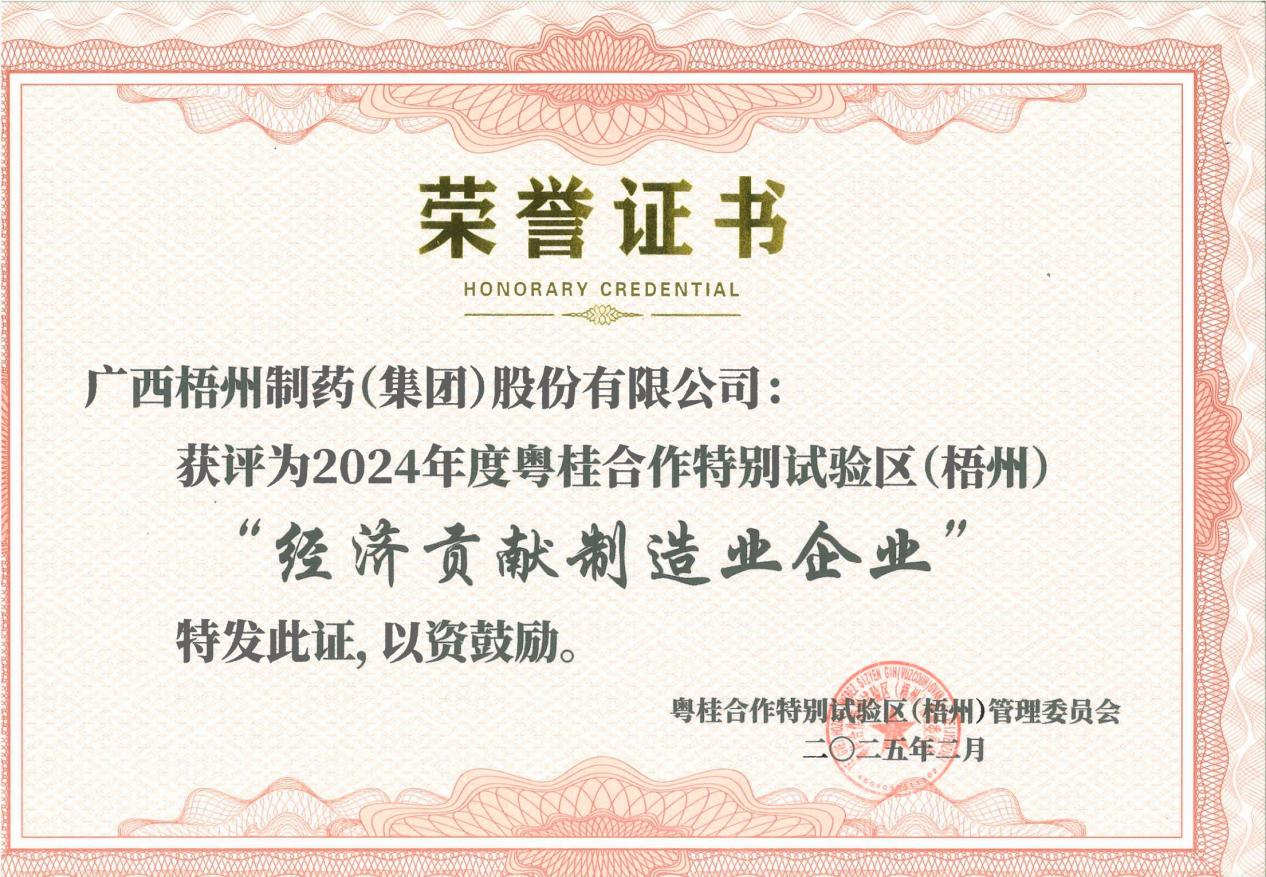 榮耀鑄輝煌 共繪粵桂夢丨梧州制藥榮獲“2024年度粵桂合作特別試驗(yàn)區(qū)(梧州)十大經(jīng)濟(jì)貢獻(xiàn)制造業(yè)企業(yè)”稱號(hào)