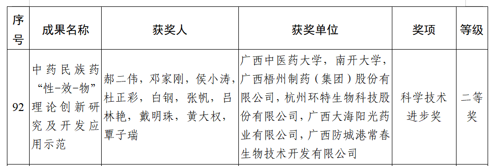 7月4日,2024年度廣西科學技術進步獎獲獎名單正式公布,廣西梧州制藥(集團)股份有限公司參與的《中藥民族藥“性-效-物”理論創(chuàng)新研究及開發(fā)應用示范》項目榮獲廣西科學技術進步獎二等獎。獲獎項目由大學院校和企業(yè)聯(lián)合完成,旨在通過創(chuàng)新的理論研究,揭示中藥和民族藥的藥效物質基礎,提升傳統(tǒng)藥物的現(xiàn)代化水平,梧州制藥作為該項目的第三完成單位,彰顯了其在中藥現(xiàn)代化研究領域的實力。