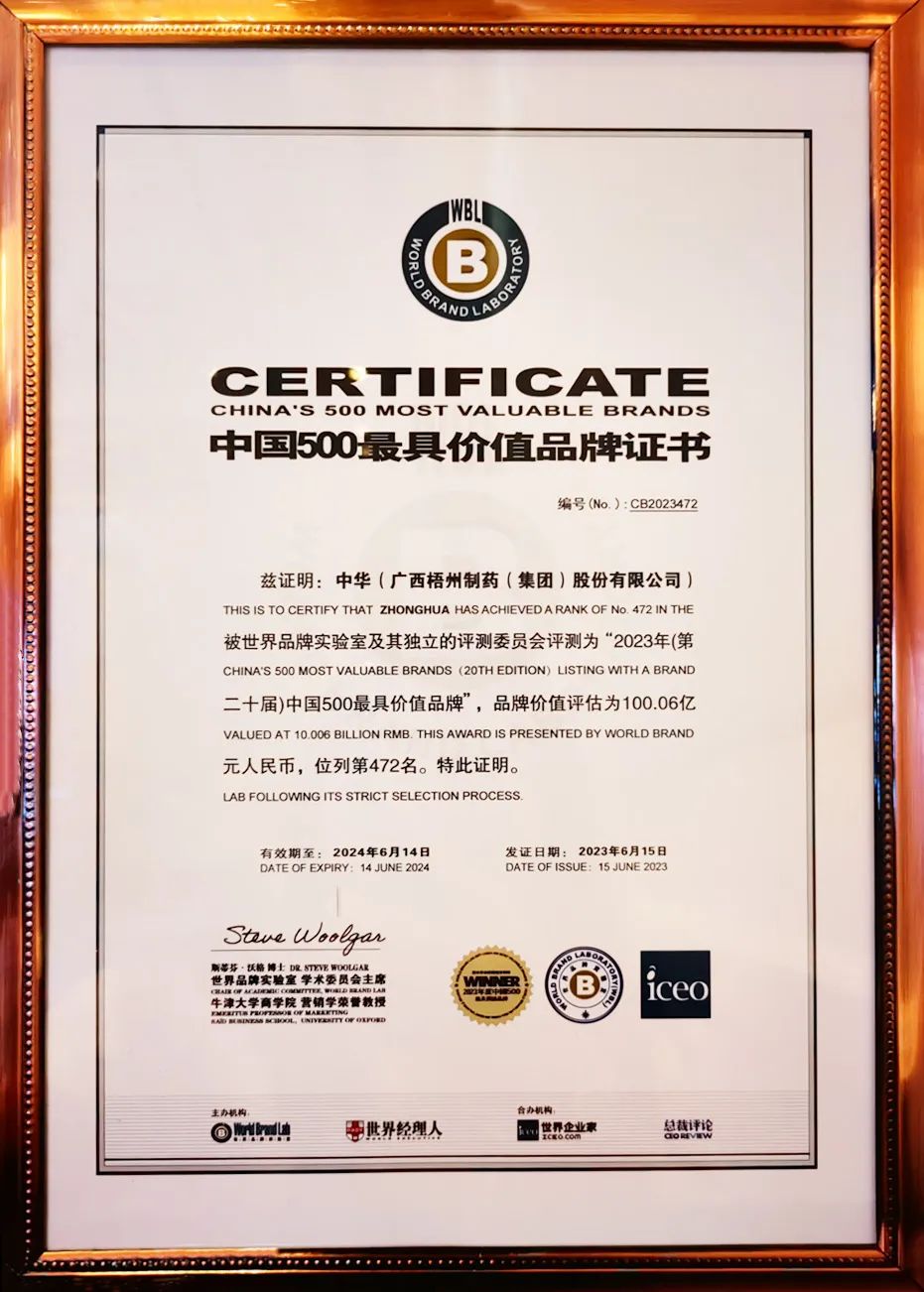 中華跌打丸為梧州制藥獨家生產(chǎn)品種,自1966年批準生產(chǎn)至今已經(jīng)臨床應用五十余年,先后收錄于2005版、2010版、2015版、2020版、2025版《中國藥典》,憑借其顯著的消腫止痛、舒筋活絡、止血生肌、活血祛瘀功效,在骨科治療領域深受認可。曾獲國家醫(yī)藥管理總局優(yōu)質產(chǎn)品獎、中華人民共和國國家質量獎銀獎等榮譽稱號,核心發(fā)明專利榮獲中國專利優(yōu)秀獎,廣西發(fā)明創(chuàng)造成果展覽獎。其產(chǎn)品商標是目前我國醫(yī)藥領域唯一一個獲準使用的“中華”商標,2023年“中華”品牌入選世界品牌實驗室發(fā)布的“中國500最具價值品牌”榜單,品牌價值評估超100億元,為當年度廣西唯一入選該榜單的醫(yī)藥品牌。