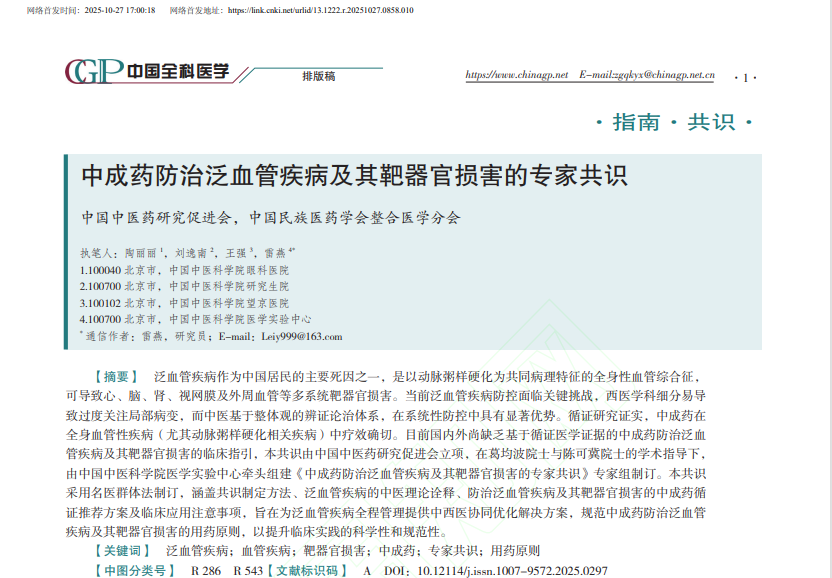 此次發(fā)布的專家共識,由葛均波院士、陳可冀院士擔(dān)任學(xué)術(shù)指導(dǎo),匯聚了43位來自全國19個省、自治區(qū)、直轄市,專業(yè)領(lǐng)域覆蓋心血管、腦血管、腎臟、眼、外周血管及內(nèi)分泌等泛血管疾病核心方向的權(quán)威專家。