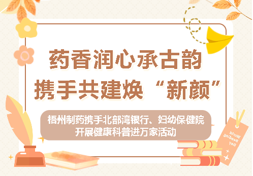 梧州制藥攜手北部灣銀行、婦幼保健院開展健康科普進(jìn)萬家活動藥香潤心承古韻 攜手共建煥“新顏”7月19日上午,梧州制藥聯(lián)合廣西北部灣銀行梧州分行營業(yè)部、梧州市婦幼保健院,在北部灣銀行大廳舉辦“中醫(yī)文化潤心